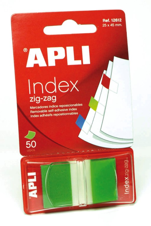 Αυτοκόλλητοι διάφανοι σελιδοδείκτες πράσινου χρώματος. Η, σε σχήμα zig-zag αποθήκευσή τους, δεν πιάνει χώρο, είναι εύχρηστη κάνοντας τους άμεσα προσβάσιμους. Διάσταση 25×45, αριθμός αυτοκόλλητων, 50.