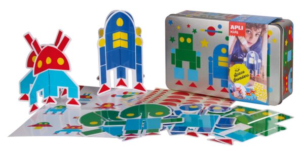 Ψυχαγωγικό και εκπαιδευτικό παιχνίδι με αυτοκόλλητα του Διαστήματος σε μεταλλικό κουτί, ιδανικό ν αποθηκεύσει τα παιδικά, αθώα, δημιουργικά μυστικά. Συμπληρώνει τα σχέδια στις κάρτες με τα ξεχωριστά γεωμετρικά αυτοκόλλητα και μπορεί να τα διορθώσει σε περίπτωση λάθους. Ενθαρρύνει την ικανότητα μηχανικού χειρισμού, συντονισμού χεριού-ματιού και τη χωρική όραση.