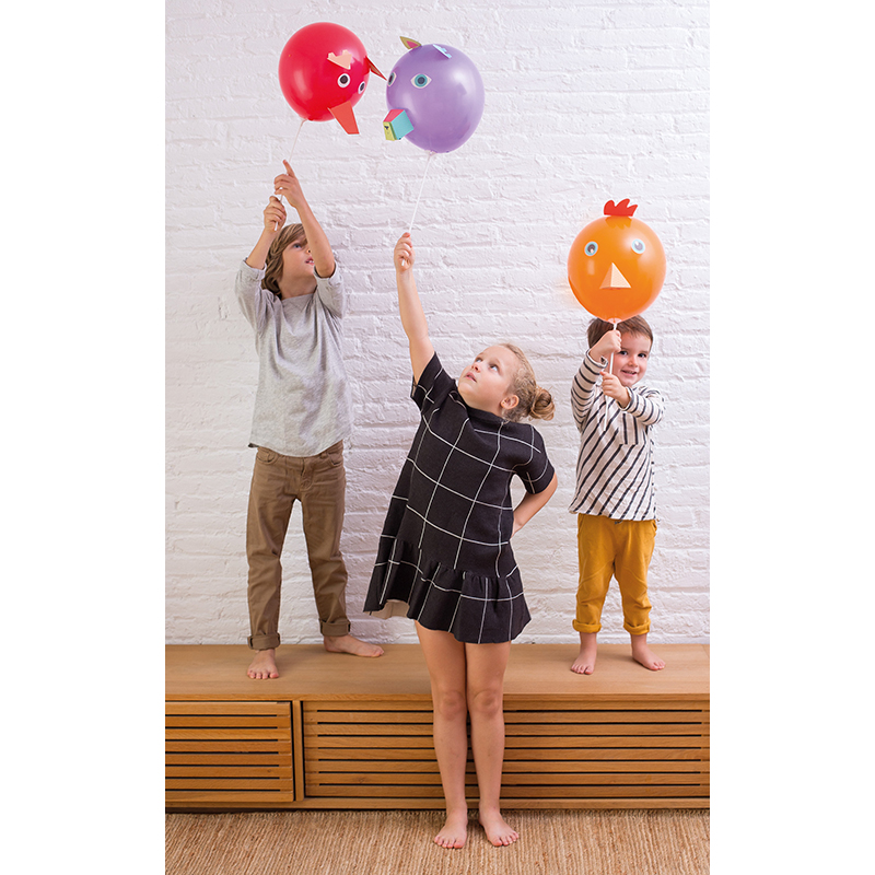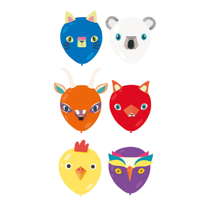 Παιχνίδι διακόσμησης 6 μπαλονιών σαν ζωάκια. Το παιχνίδι περιέχει 6 χρωματιστά μπαλόνια, 6 πλαστικά ραβδάκια, αυτοκόλλητα διαφόρων σχημάτων και 6 σχέδια ζώων, κοτοπουλάκι, γάτα, κουκουβάγια, αρκούδα, αλεπού και αντιλόπη, σ έναν πολύχρωμο κουτί φάκελο.