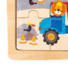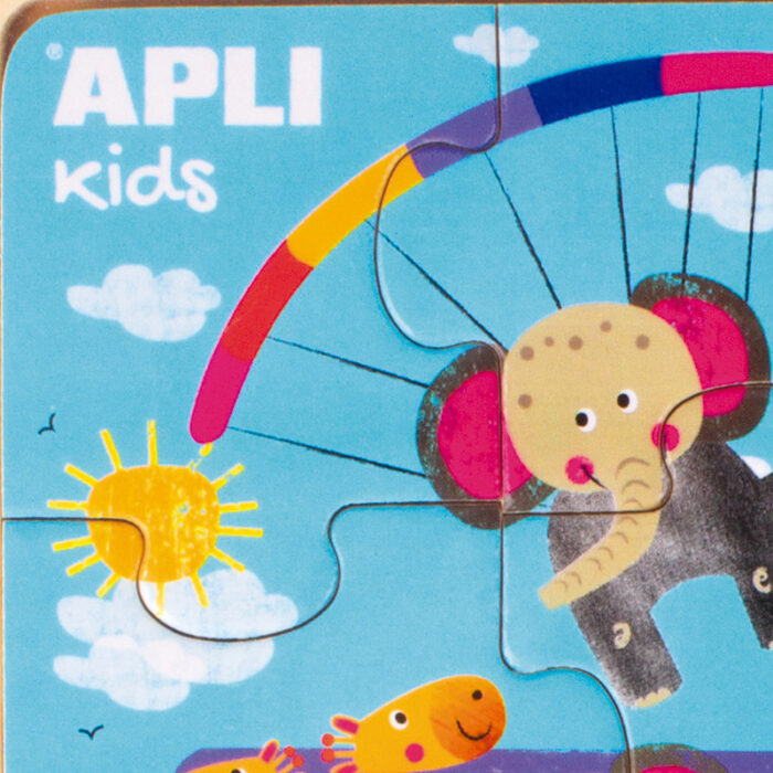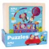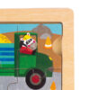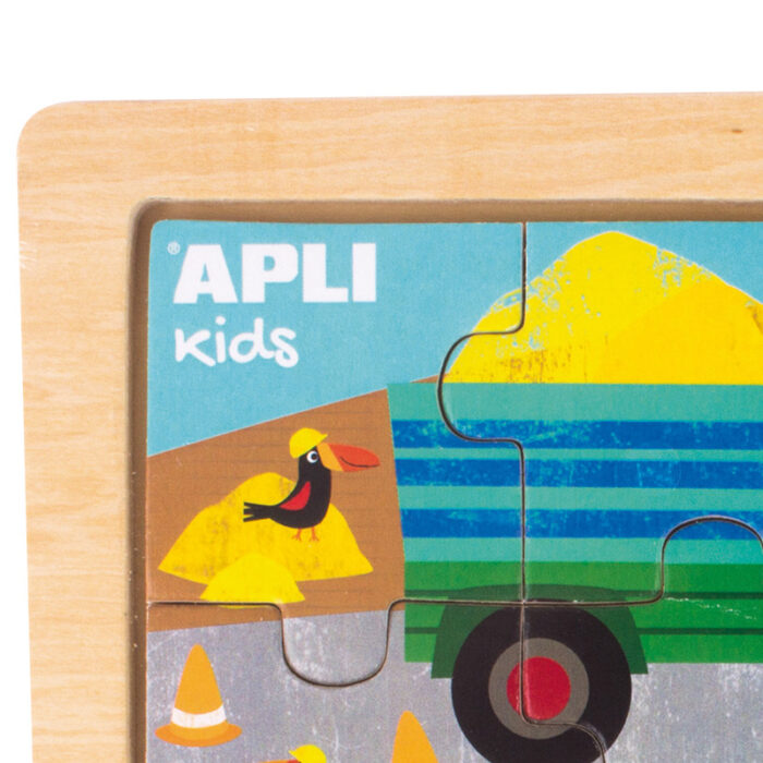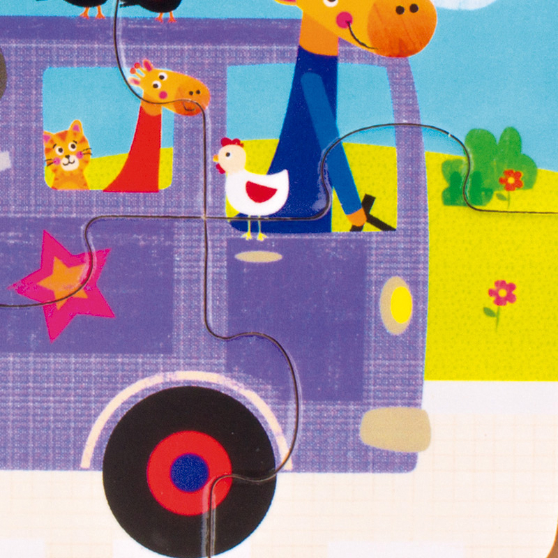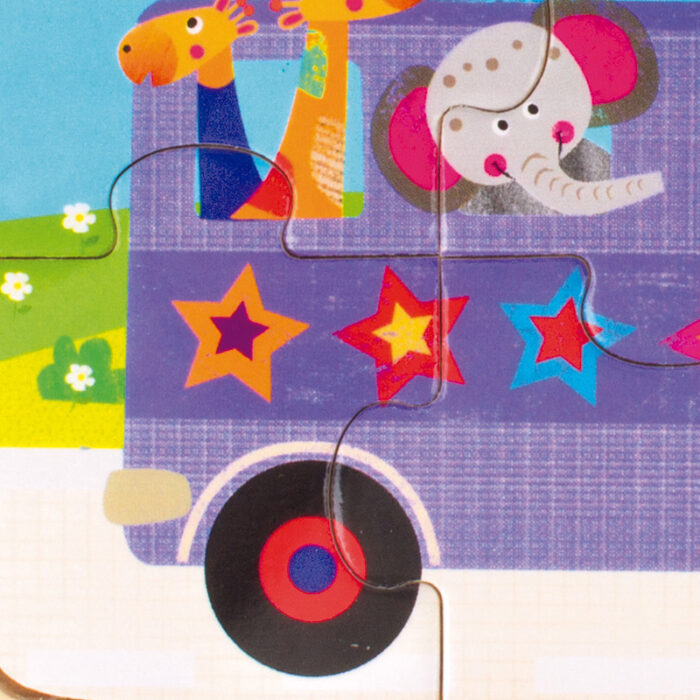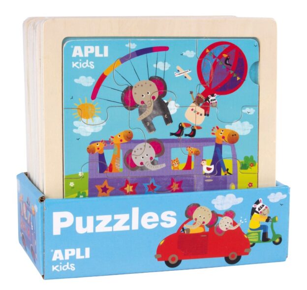 Σετ από 9 παζλ με ξύλινο οδηγό με θέμα τα ζωάκια και τις μεταφορές. Σκοπός του παιχνιδιού να διαφοροποιήσει, αναγνωρίσει και ταιριάξει το κάθε σχέδιο στο κατάλληλο σημείο. Περιέχει 3 διαφορετικά σχέδια, το λεωφορείο, το αυτοκίνητο αι το φορτηγό. Κάθε πάζλ έχει ένα χρωματικό σχέδιο τυπωμένο, γεγονός που το κάνει εύκολο για τα μικρά παιδιά ν αναγνωρίσουν γρήγορα πού τοποθετούνται τα κομμάτια. Η υφή του ξύλου αοτρέπει χτυπήματα και πεσίματα. Βοηθά στην κινητικότητα αντίχειρα και μεσαίου δάχτυλου, στην διάκριση σχημάτων, ανάπτυξη λογικής και χωρικής εξυπνάδας.